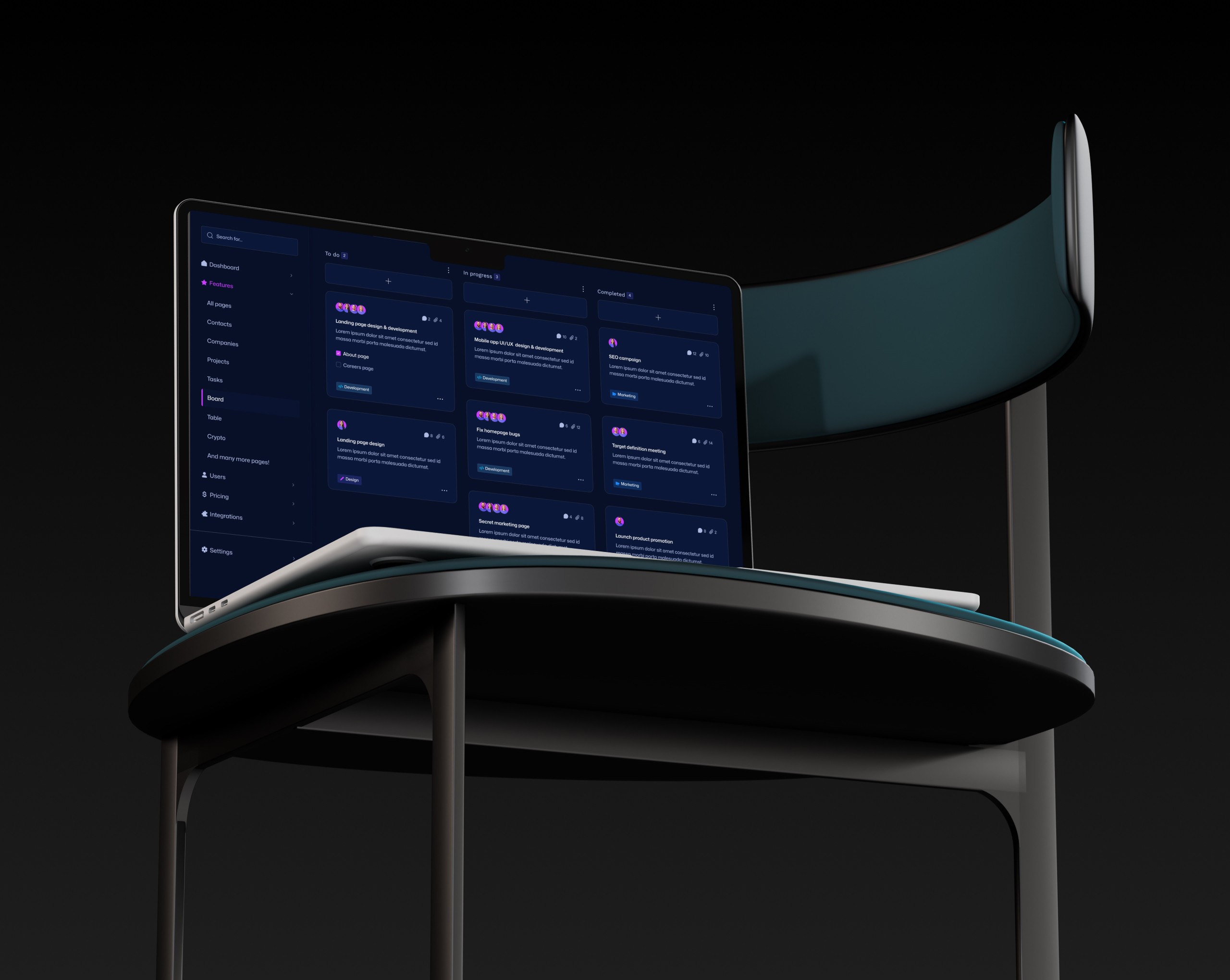 Operations teams need both time- and task-based planning. I designed a full-year calendar that works in dark mode with clear interaction states, paired with a structured Kanban board that mirrors product development stages.