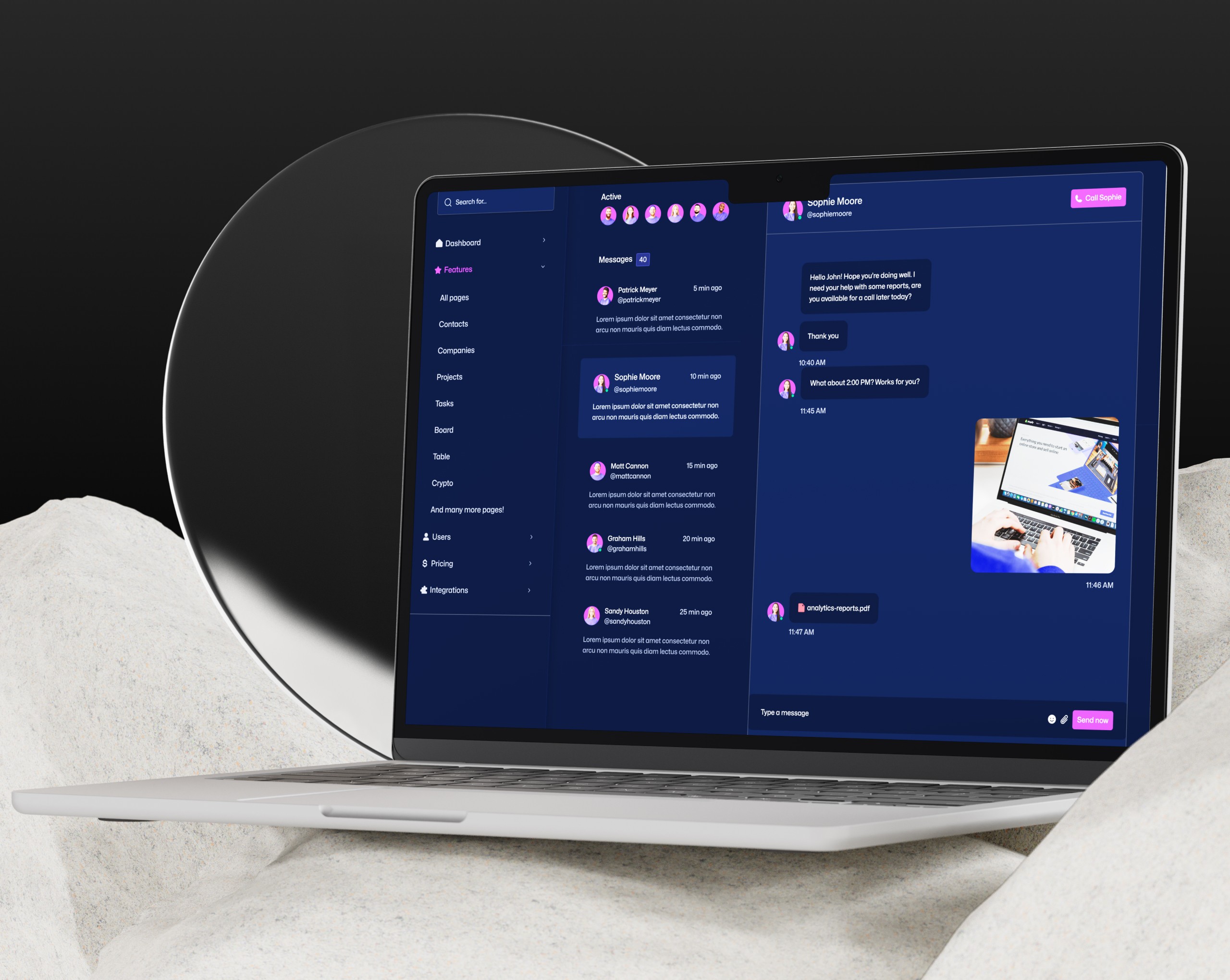 The messaging module isn’t Slack — it’s focused communication linked to work. I intentionally minimized visual noise, used neutral spacing, and enabled file previews for faster project discussions.
